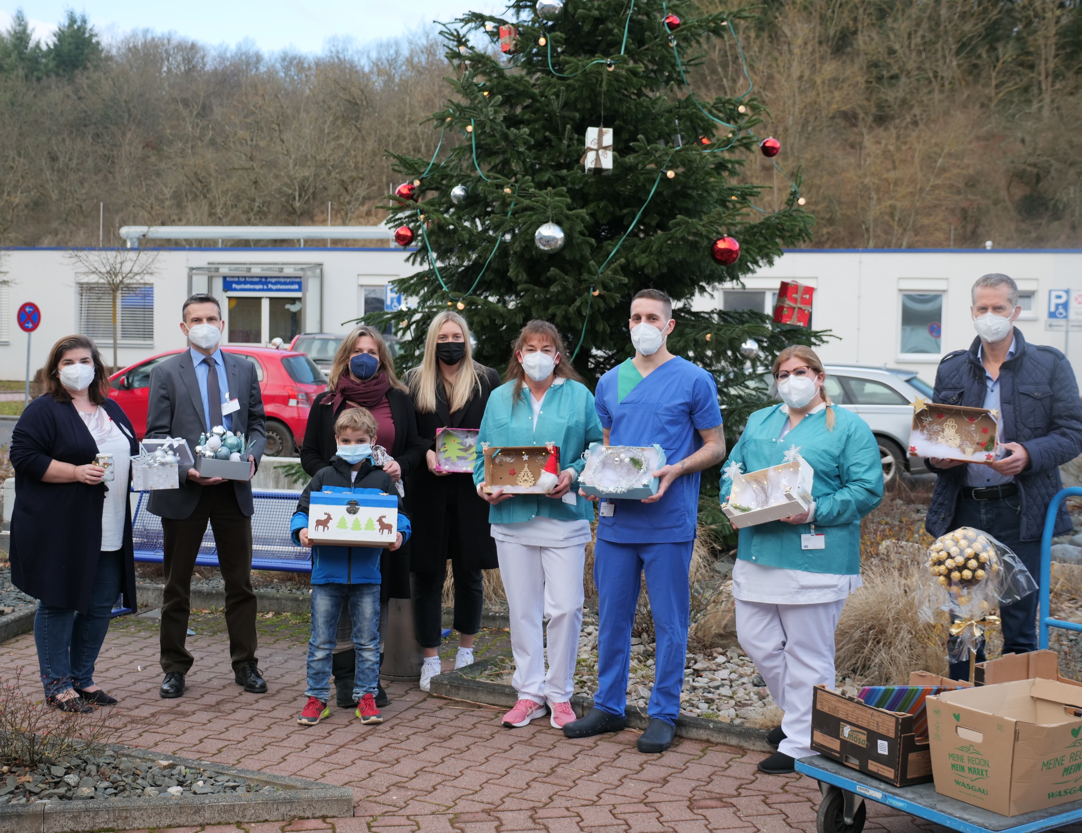 Mit großer Freude und einem herzlichen Dankeschön nahmen die Vertreter des Klinikums die Geschenke entgegen. Auf dem Foto v.l.n.r. zu sehen: Pflegedirektorin Michael Scaramuzzo-Schröer, Verwaltungsdirektor Hendrik Weinz, Heimleiterin Svenja Simon und Mitarbeiterin Malin Ohlsen mit einem jungen Heimbewohner, Stationsleitung Bianca Fey (Station 35), Fach-Gesundheits- und Krankenpfleger für Intensivpflege Mathias Brenner (Station 22), Stationsleitung Julia Porcher (Station 45) sowie Ärztlicher Direktor Dr. med. Ulrich Frey. Foto: SHG