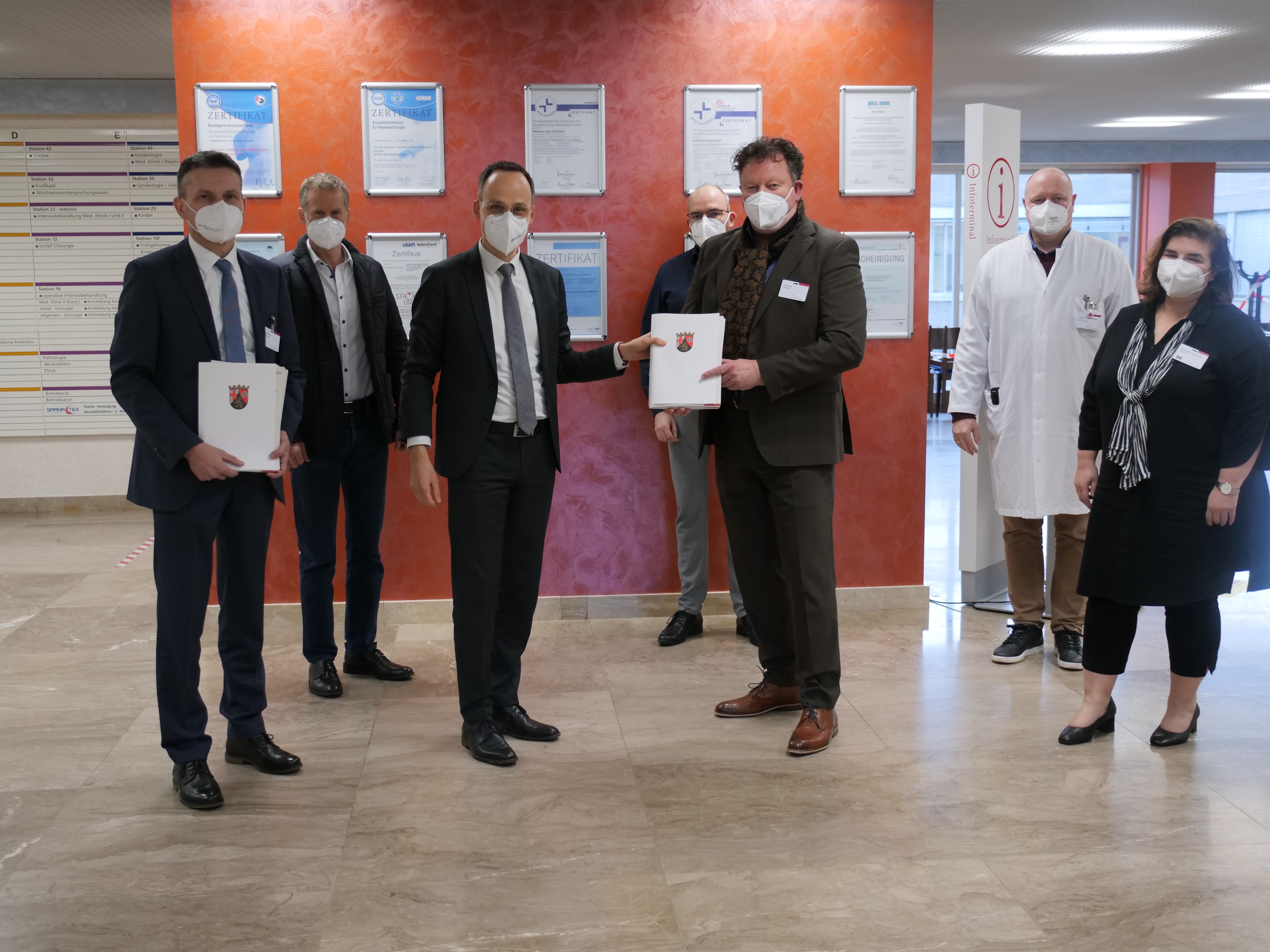 Im Verlauf des Besuchs stellten Geschäftsführer Mege und Verwaltungsdirektor Weinz sowie die weiteren Mitglieder der Klinikleitung dem Staatssekretär die Entwicklung des Klinikums der letzten fünf Jahre sowie einige Fotos aus den verschiedenen Bereichen der Klinik vor. Pandemie bedingt war eine Führung durch die Klinik nicht möglich.