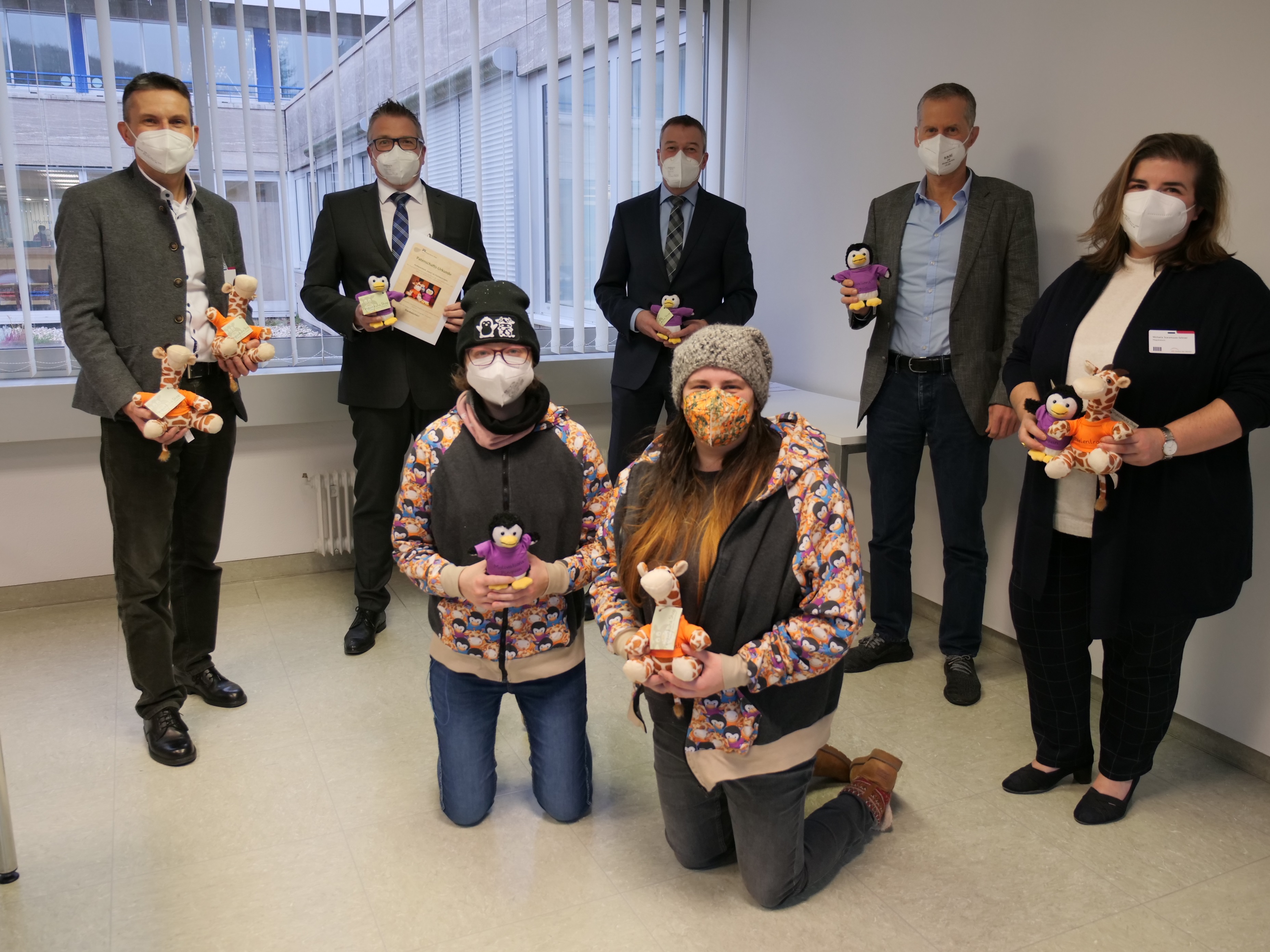 Idar-Oberstein. Wohl jedes Kind freut sich über ein Kuscheltier. Insbesondere kranke Kinder oder Kinder in Not. Das dachte sich auch der Vorstand der Raiffeisenbank „Nahe“ e.G. und spendete dem Klinikum Idar-Oberstein den großzügigen Betrag von 1.000 Euro für Kuscheltiere aus Sarah Schotts und Hanna Herzogs Pinguinkuh-Online-Shop. Die Kuscheltiere sind je zur Hälfte für die Kinderklinik und die Kinder- und Jugendpsychiatrie, Psychosomatik und Psychotherapie bestimmt.