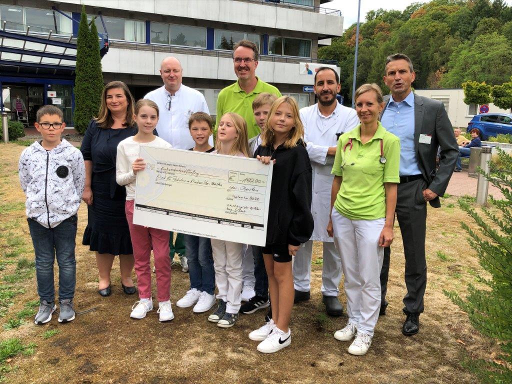 Idar-Oberstein. Die Abschlussklasse der Grundschule Wildenburg in Kempfeld hat vor dem Beginn der Sommerferien ihre Klassenklasse aufgelöst. Der großzügige Betrag von 150 € wurde zugunsten der Kinderklinik an das Klinikum Idar-Oberstein überwiesen. Bei einem Treffen am Klinikum übergaben die Schülerinnen und Schüler den Vertretern der Kinderklinik um Chefarzt Sven Nipken und dem Direktorium des Klinikums voller Stolz einen symbolischen Spendenscheck. „Wir bedanken uns herzlich für die tolle Unterstützung“, freut sich Chefarzt Sven Nipken. „Der Betrag wird direkt den Patientinnen und Patienten der Kinderklinik zu Gute kommen,“ kündigt Verwaltungsdirektor Hendrik Weinz an.