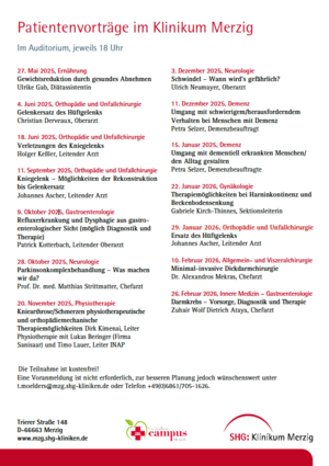 Merzig. Am Donnerstag, den 20.11.2025, fand um 18 Uhr ein vielbesuchter Vortrag zum Thema Knieschmerzen und Kniearthrose in der SHG Klinik Merzig statt. Die Veranstaltung stieß auf eine überwältigende Resonanz: Zahlreiche Interessierte nutzten die Gelegenheit, sich umfassend über Ursachen, Symptome,…