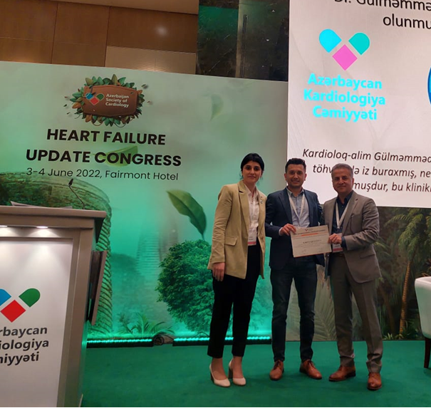 (v.l.n.r.) Aysel Islamli, Leiterin der Arbeitsgruppe Herzinsuffizienz der Aserbaidschanischen Gesellschaft für Kardiologie; Mirza Mutallimov, Oberarzt & Facharzt für Innere Medizin und Kardiologie in der Medizinischen Klinik II des Klinikum Idar-Oberstein; Uzeyir Rahimov, Präsident der Aserbaidschanischen Gesellschaft für Kardiologie