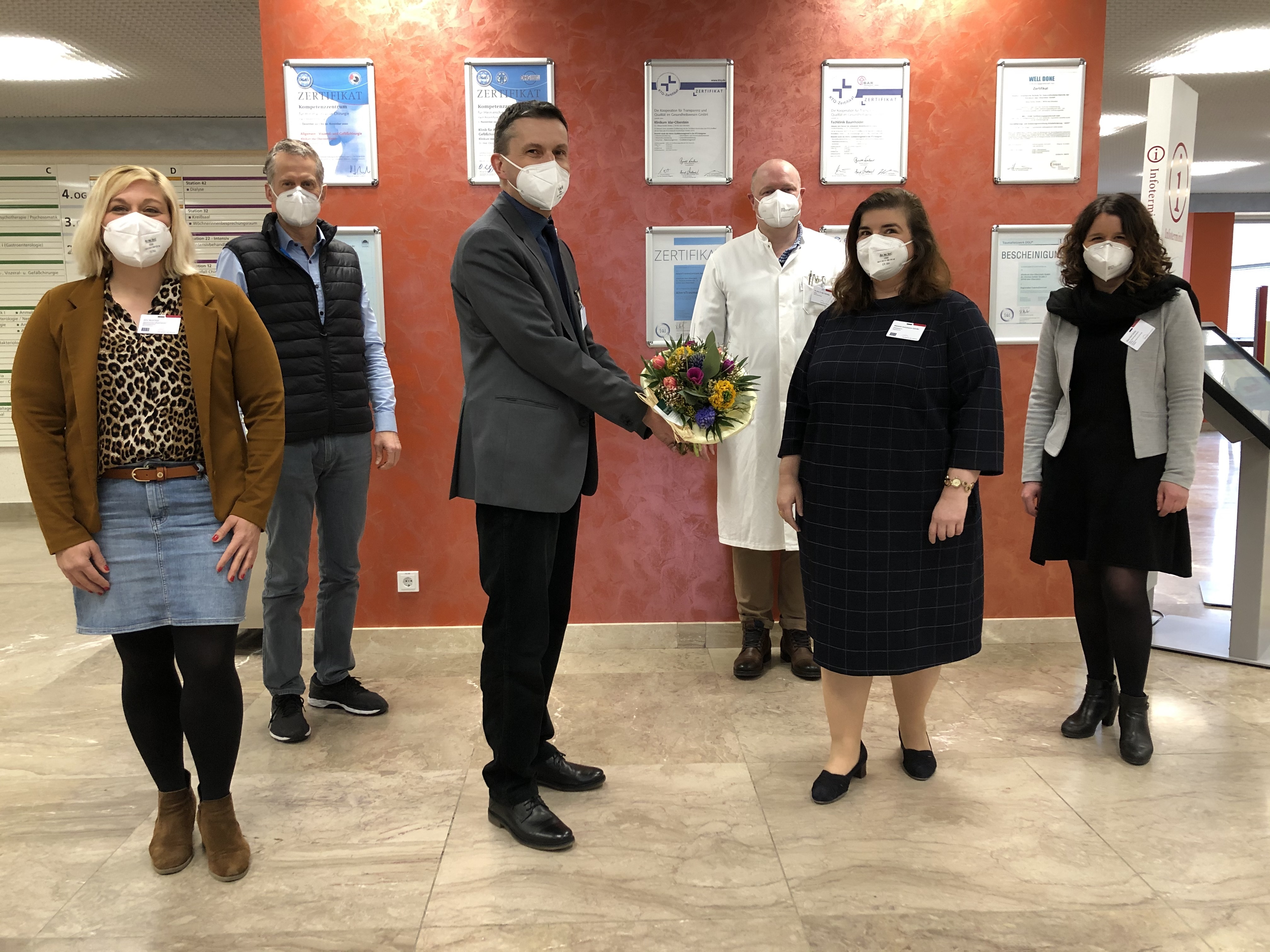 Verwaltungsdirektor Hendrik Weinz und seine Stellvertreterin Diana Wolf-Schütz, der Ärztliche Direktor Dr. med. Ulrich Frey und sein Vertreter Priv.-Doz. Dr. med. Jochen Tüttenberg sowie die kommissarische Pflegedirektorin Julia Bauerfeld hießen das neue Mitglied der Klinikleitung offiziell in ihrem Kreis willkommen und überreichten zum Start in der neuen Wirkungsstätte einen Blumenstrauß. Ein besonderer Dank galt Julia Bauerfeld, die die Funktion der kommissarischen Pflegedirektorin vorübergehend innehat.