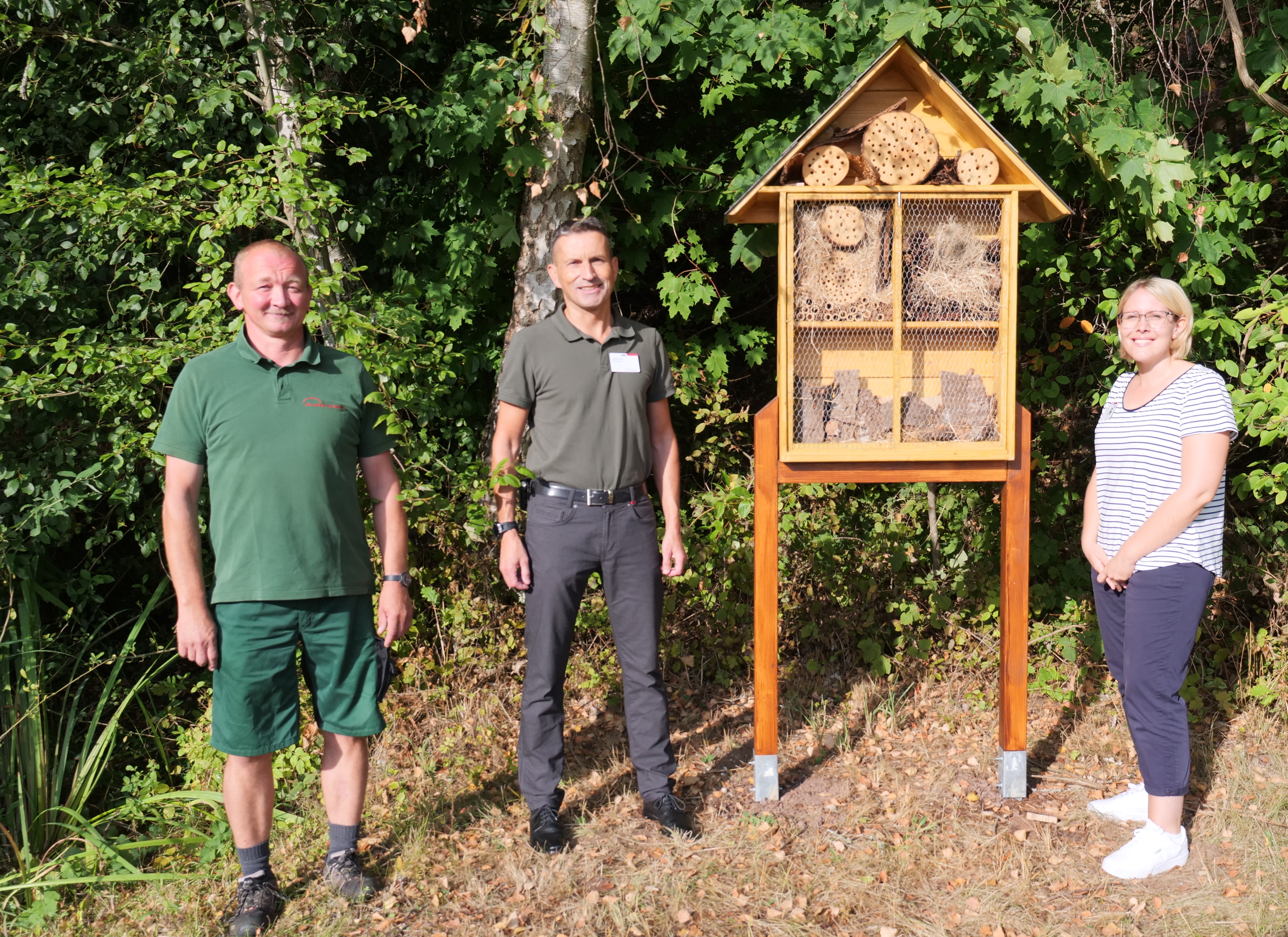 Das große Bauwerk wurde inzwischen von zwei Mitarbeitern der Technischen Abteilung am Teich hinter dem Klinikum aufgestellt. Auch auf dem Weg zum Klinikum wurden weitere Häuschen angebracht, an denen sich nun viele Insekten erfreuen können.