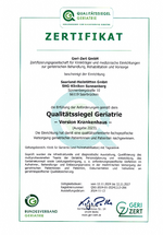 MSzert GmbH bescheinigt, dass die Einrichtung SHG-Kliniken Sonnenberg vollständig die Anforderungen des Qualitätssiegels Geriatrie Add-on (Ausgabe 2016) erfüllt und damit eine fachspezifische Versorgung geriatrischer Patienten nachgewiesen hat.