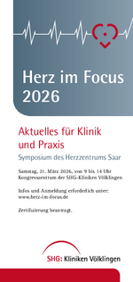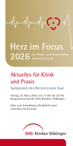 Ganz herzlich laden wir Sie zu "Herz im Focus" am 20. und 21. März 2026 in das Kongresszentrum der SHG-Kliniken Völklingen ein! Dieses Mal als reine Präsenzveranstaltung! Wir freuen uns darauf, Sie persönlich begrüßen zu dürfen.